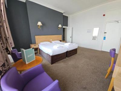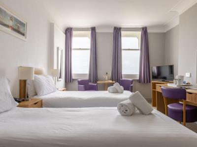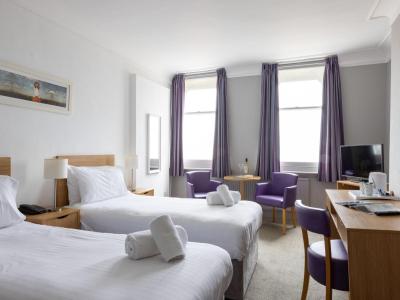 - Twin room with separate beds and views towards Eastbourne’s seafront.